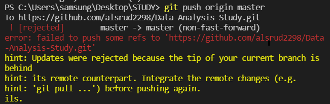 최근 데이터 분석 스터디를 진행하면서 공부한 내용을 Git에 업로드하려고 하는데 계속 아래와 같은 에러가 발생했어요..